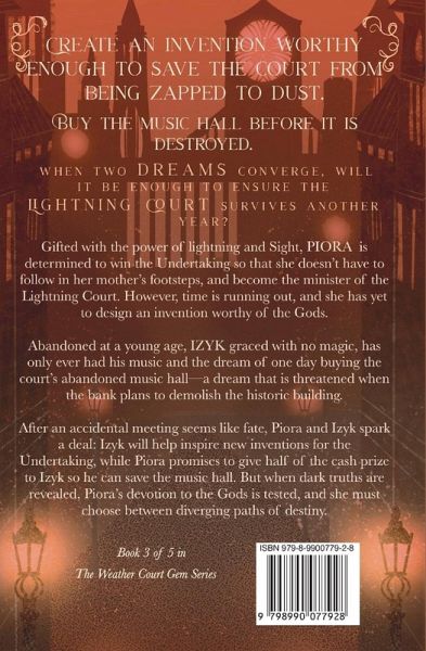 Create an invention worthy enough to save the court from being zapped to dust. Buy the music hall before it is destroyed. When two dreams converge, will it be enough to ensure the Lightning Court survives another year? Gifted with the power of lightning and Sight, Piora is determined to win the Undertaking so that she doesn't have to follow in her mother's footsteps, and become the minister of the Lightning Court. However, time is running out, and she has yet to design an invention worthy of the Gods. Abandoned at a young age, Izyk, graced with no magic, has only ever had his music and the dream of one day buying the court's abandoned music hall-a dream that is threatened when the bank plans to demolish the historic building. After an accidental meeting seems like fate, Piora and Izyk spark a deal: Izyk will help inspire new inventions for the Undertaking, while Piora promises to give half of the cash prize to Izyk so he can save the music hall. But when dark truths are revealed, Piora's devotion to the Gods is tested, and she must choose between diverging paths of destiny. Of Lightning and Topaz is the third installment in the Weather Court Gem series. Each standalone novella follows a different couple in their respective court (Snow, Thunder, Lightning, Rain, & Sun), each faced with the challenge of following their heart as the fate of their court's power rests in their hands.