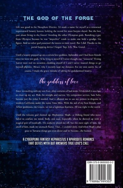 The god of the forge... Life was good in the Neosphere District. I'd made a name for myself as a renowned supernatural bounty hunter, holding the record for most harpies slayed. But the best part about living in the future? Avoiding the other Olympian gods. Banishing a guy from Olympus because he was "imperfect" tends to make one hold a grudge. Go figure. And no other god possessed the means to time travel. But I did. Thanks to the portal hopping device I forged. Yup. Life. Was. Grand. Until a bounty popped up on a certain love goddess. Aphrodite and I had been friends since we were wee gods. I'd be lying to myself if I never thought our "innocent" flirting banter were real on occasion-kidding myself if I said I never wanted things to go beyond platonic. Hence, why I recently kept my distance. For my own sanity. So, of course, I made the grave mistake of taking the godsdamned bounty. The goddess of love... Since reconciling with my son Eros, after centuries of bad mojo, I'd decided it was time to clean up my act. Ride the straight and narrow. My companion service, Sans Solo, became just the ticket I needed. And it allowed me to use my powers in disguise in modern California under the name Vena Milo. With the aid of my best friends, and fellow goddesses, the Graces, we ran a legitimate business. All was right in the world. Until the volcano god showed up. Hephaistos. Heph-a lifelong friend who never failed to confuse me mind, body, and soul. Especially when he showed up with a magical pair of handcuffs. His audacity pissed me off, but the mere sight of him, the smell of him, made my stomach flutter. That...I couldn't deny. And when Heph's plan goes to Tartarus things got even dicier and we became...the hunted. -A cyberpunk fantasy Hephaestus x Aphrodite romance that defies myth but answers true love's call-