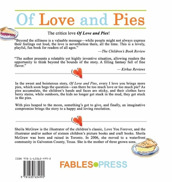 Can there ever be too much love or too much pie? In this sweet and boisterous story, whenever the narrator says 'I love you' somewhere a baker bakes several pies. As the pies accumulate, the children's hands and faces are always sticky, and all their clothes have berry stains, while outdoors, kids who once got stuck in the mud now get stuck in the pies! Finally, when pies are heaped as high as the moon, and everyone is on pie-overload, something's got to give, and a satisfying compromise brings the story to a happy and loving resolution.
