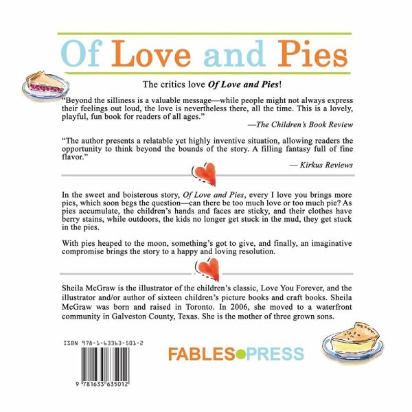 Can there ever be too much love or too much pie? In this sweet and boisterous story, whenever the narrator says 'I love you' somewhere a baker bakes several pies. As the pies accumulate, the children's hands and faces are always sticky, and all their clothes have berry stains, while outdoors, kids who once got stuck in the mud now get stuck in the pies! Finally, when pies are heaped as high as the moon, and everyone is on pie-overload, something's got to give, and a satisfying compromise brings the story to a happy and loving resolution.