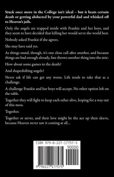 * The series is now COMPLETE! * Stuck once more in the College isn't ideal - but it beats certain death or getting abducted by your powerful dad and whisked off to Heaven's jails. Only the angels are trapped inside with Frankie and her boys, and they seem to have decided that killing her would serve the world best. Nobody asked Frankie if she agrees. She may have said yes. As things stand, though, it's one close call after another, and because things are bad enough already, fate throws another thing into the mix: How about some games to the death? And shapeshifting angels? Never ask if life can get any worse. Life tends to take that as a challenge. A challenge Frankie and her boys will accept. No other option left on the table. Together they will fight to keep each other alive, hoping for a way out of this mess. Together. Together or never, and their love might be the ace up their sleeve, because Heaven never saw it coming at all... * look inside the book for warnings and tropes *