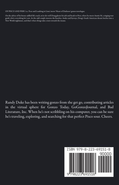 OF PISCO AND PERU is a 'Fear and Loathing in Lima' meets 'Heart of Darkness' gonzo travelogue. On the advice of his booze-addled life coach, ne'er-do-well Doug ghosts his job and heads to Peru, where he meets Auntie M, a singing tour guide who's everything he's not. As the odd couple traverse the beaches, Andes and byways, Doug's South American dream lurches into a New World nightmare, and that's when things take a turn towards the insane.