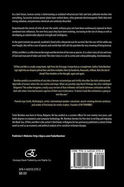 In a dark future, human society is deteriorating as outdated infrastructure fails and toxic pollution leeches into everything. Successive nuclear power plants have melted down, cities generate electromagnetic fields that emit strong radiation, and poisonous chemicals are carelessly discarded. Deep beneath the streets of cities all over the world, ordinary grey rats have been continuously exposed to these combined toxic influences. For over forty years they have been evolving, increasing to the size of sheep as well as developing an unbelievable physical strength and intelligence. As the giant mutant rats spread, mankind is faced with a desperate war for survival. But this war will be unlike any ever fought; this will be a war of species and worlds that will call into question the very meaning of being human. Of Rats and Men is a reflection on the origin and the decline of the man as species. It is a short story of rats and men, of God and man and of robot and men! This short story is a call to action and a deep philosophy, simultaneously. "Of Rats and Men is a really creepy book, right from the first page. I mean that as a compliment. Author Todor Bombov taps right into our deepest primal fears and then multiplies them by hundreds, thousands, millions. Rats the size of sheep?! One shudders at the thought, again and again. Bombov predicts an evolution of rats into a human-rat prototype and vividly describes the dark underground labyrinths of sewers where the rats evolve and reign. What can possibly stop them? Perhaps the ultra-intelligent Diogenes? The author imagines a really scary version of that millennia-old battle between civilization and the dark side when 'men had become captives of their own recklessness.' It doesn't look like civilization is going to win this one." - Pamela Jaye Smith, Mythologist, writer, international speaker-consultant, award-winning director-producer, and author of five books for media-makers. Founder of MYTHWORKS Todor Bombov was born in Varna, Bulgaria. He has worked as a customs officer for over twenty-two years, and holds degrees in economics and computer technology. Mr. Bombov devotes his free time to writing and enjoying the Black Sea. Of Rats and Men is the author's third book; in Bulgaria he has previously published a science fiction novel as well as an economic and political analysis of ex-socialism in Eastern Europe. Publisher's website: http://sbpra.com/TodorBombov