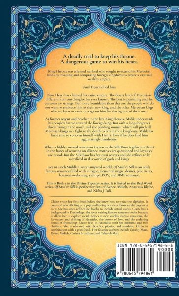 A deadly trial to keep his throne. A dangerous game to win his heart. King Heroux was a famed warlord who sought to extend his Merovian lands by invading and conquering foreign kingdoms to create a vast and wealthy empire. Until Henri killed him. Now Henri has claimed his entire empire. The desert land of Merovia is different from anything he has ever known. The heat is punishing and the customs are strange. But more formidable than that are the people who do not want to embrace him as their new king, and the other Merovian kings who are keen to exact revenge on him for slaying one of their own. As former regent and brother to the late King Heroux, Malik understands his people's hatred toward the foreign king. But with a long-forgotten threat rising in the north, and the pending summit which will pitch all Merovian kings in a fight to the death to retain their kingdoms, Malik has little time to concern himself with Henri. Even if he does find him aggravatingly handsome. When a highly coveted courtesan known as the Silk Rose is gifted to Henri in the hopes of securing an alliance, motives are questioned and loyalties are tested. But the Silk Rose has her own secrets, and she refuses to be sacrificed in this world of gods and kings. Set in a rich Middle Eastern inspired world, Of Sand & Silk is an adult fantasy romance filled with intrigue, elemental magic, deities, plot twists, bisexual awakening, multiple POV, and MMF romance. This is Book 1 in the Divine Tapestry series. It is linked to the Red Wood series. Of Sand & Silk is perfect for fans of Renee Ahdieh, Anastasis Blythe, and Nisha J Tuli.