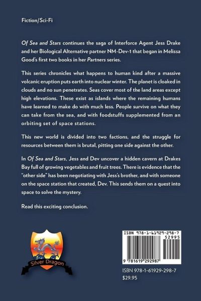 Of Sea and Stars continues the saga of Interforce Agent Jess Drake and her Biological Alternative partner NM-Dev-1 that began in Melissa Good’s first two books in her Partners series. This series chronicles what happens to humankind after a massive volcanic eruption puts earth into nuclear winter. The planet is cloaked in clouds and no sun penetrates. Seas cover most of the land areas except high elevations. These exist as islands where the remaining humans have learned to make do with much less. People survive on what they can take from the sea, and with foodstuffs supplemented from an orbiting set of space stations. This new world is divided into two factions, and the struggle for resources between them is brutal, pitting one side against the other. In Of Sea and Stars, Jess and Dev uncover a hidden cavern at Drakes Bay full of growing vegetables and fruit trees. There is evidence that the "other side" has been negotiating with Jess’s brother, and with someone on the space station that created Dev. This sends them on a quest into space to solve the mystery.