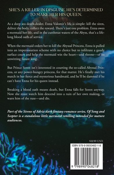 She's a killer in disguise. He's determined to make her his queen. As a deep sea death-dealer, Enna Valomir's life is simple: kill the siren, deliver the body, collect the reward. There's just one problem. Enna owes a mermaid her life, and in the cutthroat waters of the Abyss, that's a lifelong blood oath of service. When the mermaid orders her to kill the Abyssal Princess, Enna is pulled into an impersonation scheme with no choice but to infiltrate a gaudy surface court and help the mermaid win the heart-and throne-of its unwitting future king. But Prince Soren isn't interested in courting the so-called Abyssal Princess, or any power-hungry princess, for that matter. He's finally met his match in her fierce and mysterious handmaid, and he'll be damned if he can't have Enna for his queen instead. Breaking a blood oath means death, but Enna falls for Soren anyway. Now she must watch him descend into a ruin of her own making, or warn him of the ruse-and die. Part of the Sirens of Adria dark fantasy romance series, Of Song and Scepter is a standalone little mermaid retelling for readers who like their fairytales morally grey.