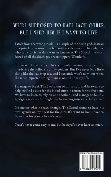 We're supposed to hate each other, but I need him if I want to live. I stole from the wrong mark- a disciple of the death god. Instead of a priceless treasure, I'm left with a killer curse. The only one who can stop it? A dark warrior known as The Sword, the most feared of all the death god's worshippers. Wonderful. To make things worse, he's currently rotting in a cell for murdering the followers of my goddess. But I've never let a little thing like the law stop me, and I certainly won't now, not when the most important thing to me is on the line: my life. I manage to break The Sword out of his prison, and he swears to help me find a cure for the blood curse in return for his freedom. We have to learn to rely on one another... and manage to build a grudging respect that might just be turning into something more. No matter what he says, though, The Sword seems to have his own agenda on my quest for the cure. If I want to live, I have to figure out his plan before it's too late. Trust's never come easy to me, but betrayal's never hurt so much.