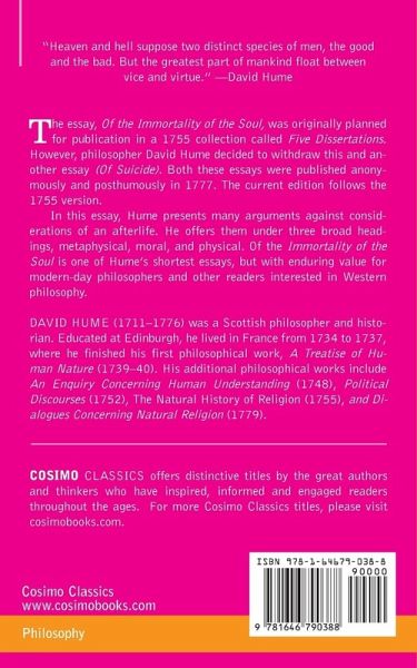 "Heaven and hell suppose two distinct species of men, the good and the bad. But the greatest part of mankind float between vice and virtue." -David Hume The essay, Of the Immortality of the Soul, was originally planned for publication in a 1755 collection called Five Dissertations. However, philosopher David Hume decided to withdraw this and another essay (Of Suicide). Both these essays were published anonymously and posthumously in 1777. The current edition follows the 1755 version. In this essay, Hume presents many arguments against considerations of an afterlife. He offers them under three broad headings, metaphysical, moral, and physical. Of the Immortality of the Soul is one of Hume's shortest essays, but with enduring value for modern-day philosophers and other readers interested in Western philosophy.