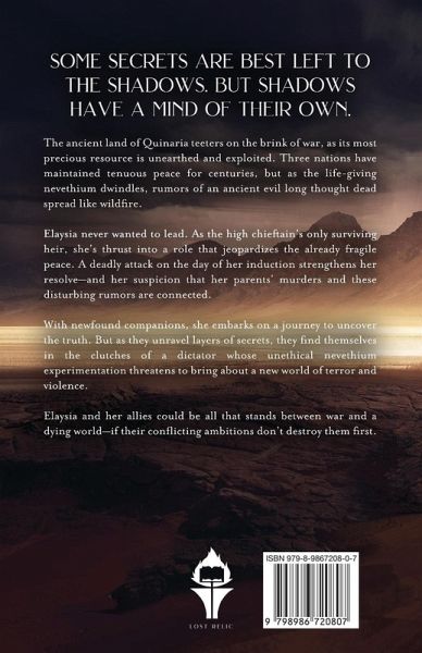 Some secrets are best left to the shadows. But shadows have a mind of their own. The ancient land of Quinaria teeters on the brink of war, as its most precious resource is unearthed and exploited. Three nations have maintained tenuous peace for centuries, but as the life-giving nevethium dwindles, rumors of an ancient evil long thought dead spread like wildfire. Elaysia never wanted to lead. As the high chieftain's only surviving heir, she's thrust into a role that jeopardizes the already fragile peace. A deadly attack on the day of her induction strengthens her resolve-and her suspicion that her parents' murders and these disturbing rumors are connected. With newfound companions, she embarks on a journey to uncover the truth. But as they unravel layers of secrets, they find themselves in the clutches of a dictator whose unethical nevethium experimentation threatens to bring about a new world of terror and violence. Elaysia and her allies could be all that stands between war and a dying world-if their conflicting ambitions don't destroy them first.
