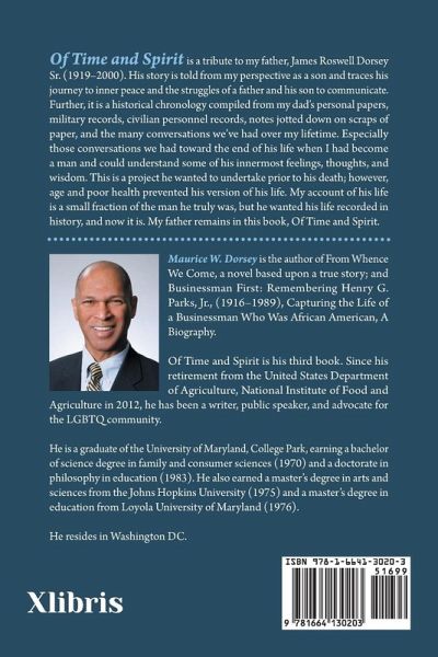 Of Time and Spirit is a tribute to my father, James Roswell Dorsey Sr. (1919-2000). His story is told from my perspective as a son and traces his journey to inner peace and the struggles of a father and his son to communicate. Further, it is a historical chronology compiled from my dad's personal papers, military records, civilian personnel records, notes jotted down on scripts of paper, and the many conversations we've had over my lifetime. Especially those conversations we had toward the end of his life when I had become a man and could understand some of his innermost feelings, thoughts, and wisdom. This is a project he wanted to undertake prior to his death; however, age and poor health prevented his version of his life. My account of his life is a small fraction of the man he truly was, but he wanted his life recorded in history, and now it is. My father remains in this book, Of Time and Spirit.