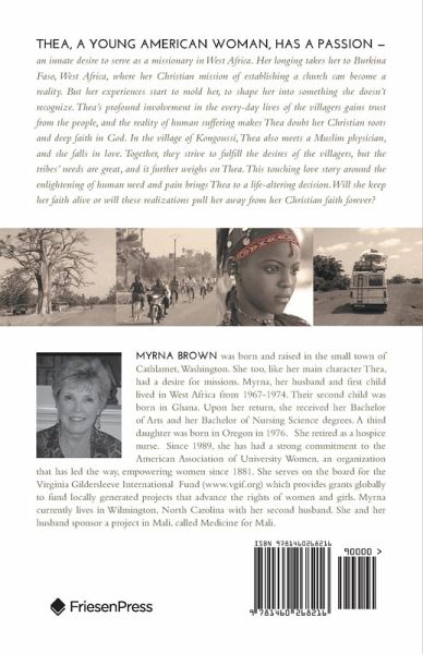 THEA, A YOUNG AMERICAN WOMAN, HAS A PASSION - an innate desire to serve as a missionary in West Africa. Her longing takes her to Burkina Faso, West Africa, where her Christian mission of establishing a church can become a reality. But her experiences start to mold her, to shape her into something she doesn't recognize. Thea's profound involvement in the every-day lives of the villagers gains trust from the people, and the reality of human suffering makes Thea doubt her Christian roots and deep faith in God. In the village of Kongoussi, Thea also meets a Muslim physician, and she falls in love. Together, they strive to fulfill the desires of the villagers, but the tribes' needs are great, and it further weighs on Thea. This touching love story around the enlightening of human need and pain brings Thea to a life-altering decision. Will she keep her faith alive or will these realizations pull her away from her Christian faith forever?
