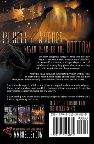 In Hell The Anchor Never Reaches The Bottom... The most dangerous voyage of their lives has now begun-- a suicide mission to rescue one of their own. A werewolf, a vampire, a dragon slayer, a pair of witches and a lovely lady pirate who captains a ship laden with a mysterious and dangerous cargo. Only this small band, and the secrets they carry within; some in their minds, some in their hearts, and for those who still have them, some in their eternally tarnished souls. For the saints are still broken. One is already trapped in Hell-- the others are trapped in their own tortured pasts. One of them knows how to get into Hell-- but none of them know how to get out. Too many secrets, too many obstacles; too few answers. A stalwart ship with broken saints, traveling along wind-driven seas to a Hell they can't find and a guide they can't trust...