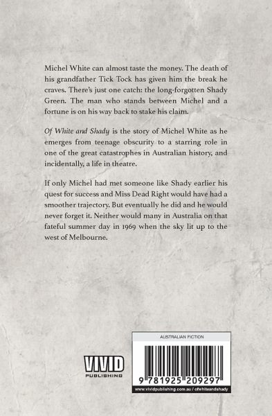 Michel White can almost taste the money. The death of his grandfather Tick Tock has given him the break he craves. There's just one catch: the long-forgotten Shady Green. The man who stands between Michel and a fortune is on his way back to stake his claim. 'Of White and Shady' is the story of Michel White as he emerges from teenage obscurity to a starring role in one of the great catastrophes in Australian history, and incidentally, a life in theatre. If only Michel had met someone like Shady earlier his quest for success and Miss Dead Right would have had a smoother trajectory. But eventually he did and he would never forget it. Neither would many in Australia on that fateful summer day in 1969 when the sky lit up to the west of Melbourne.