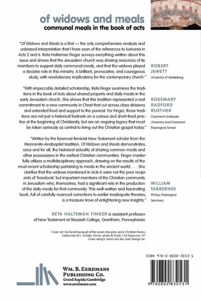 Though "community" has become a common byword in the contemporary Western church, the practice of communal sharing has effectively fallen by the wayside. Unfortunately, it is often the poor who are left wanting because we no longer come together. Reta Halteman Finger finds a solution to this modern problem by learning from the ancient Mediterranean Christian culture of community. In the earliest Jerusalem church, in holding the responsibility for preparing and serving communal meals, women were given a place of honor. With the table fellowship and goods sharing of the early church, Luke says, "there were no needy persons among them" (Acts 4:34). Finger thoroughly examines this agape-meal tradition, challenging traditional interpretations of the "community of goods" in the Jerusalem church and proving that the communal sharing lasted for hundreds of years longer than previously assumed. Of Widows and Meals begins a discussion of need in community that can revolutionize the contemporary church's interaction with the world at large.