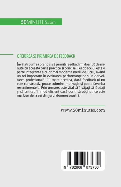 Înv¿¿äi cum s¿ oferi¿i ¿i s¿ primi¿i feedback în doar 50 de minute cu aceast¿ carte practic¿ ¿i concis¿. Feedback-ul este o parte integrant¿ a celor mai moderne medii de lucru, având un rol important în evaluarea performan¿elor ¿i în dezvoltarea profesional¿. Cu toate acestea, dac¿ feedback-ul nu este constructiv, poate submina motiväia ¿i poate favoriza resentimentele. Prin urmare, este vital s¿ înv¿¿äi s¿ l¿udäi ¿i s¿ criticäi în mod eficient dac¿ dori¿i s¿ ob¿ine¿i ce este mai bun de la cei din jurul dumneavoastr¿. În aceast¿ carte, ve¿i afla cum feedback-ul constructiv poate fi util în managementul echipei, în reläiile profesionale ¿i în dezvoltarea personal¿. De asemenea, include sfaturi utile despre când ¿i cum s¿ oferi¿i feedback ¿i sfaturi despre cum s¿ acceptäi feedback-ul din partea altora, astfel încât s¿ pute¿i profita la maximum de aceast¿ oportunitate valoroas¿ pentru a v¿ îmbun¿t¿¿i performan¿a.