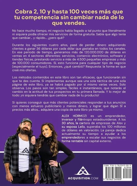 ** MÁS DE 500.000 EJEMPLARES VENDIDOS ** ¡Número 1 en ventas en Amazon durante más de DOS AÑOS! Me llevé a casa más en un año que los directores ejecutivos de McDonalds, IKEA, Ford, Motorola y Yahoo....combinados....cuando era un chaval de veinte años....utilizando el método de la oferta de 100 millones de dólares. Funciona. Y funcionará para ti. Sin embargo, no hace mucho, mi negocio había empeorado tanto que, literalmente, ni siquiera podía ofrecer mis servicios gratis. Al final de cada mes, miraba mi cuenta bancaria esperando ver progreso (pero no lo había). Sabía que algo tenía que cambiar... ¿pero qué? En los 48 meses siguientes, pasé de perder dinero a ganar 36 dólares por cada dólar gastado. En ese periodo de tiempo, generamos más de 120 millones de dólares en cuatro sectores diferentes: servicios, comercio electrónico, software y tiendas físicas. Pero, a diferencia de todos los demás, no teníamos grandes embudos, grandes anuncios, o un nicho rico. De hecho, ni siquiera enviamos correos electrónicos hasta que superamos los 50 millones de dólares en ventas. En cambio, fuimos capaces de hacer una cosa realmente bien: .... creamos ofertas tan buenas, que la gente se sentía estúpida diciendo que no. Esto es exactamente lo que este libro le mostrará cómo hacer: * Cómo Cobrar Mucho Más De Lo Que Cobras Actualmente... a- El Proceso de Pequeño Mercado y Gran Dinero que usamos para enfocarnos con láser en nichos de mercado rebosantes de dinero. b- La fórmula "injusta" de fijación de precios....cómo multiplicamos por 100 nuestros precios (y conseguimos que más gente diga que sí....de verdad) c- El Value Flip...para que nunca más te vuelvan a comparar precios (es una promesa) d- El ciclo virtuoso del precio... utilízalo para superar a tu competencia (para bien) mientras utilizas tu producto para atraer a los mejores talentos. * Cómo hacer que su producto sea tan bueno que los clientes potenciales encuentren la forma de pagarlo a- La ecuación del valor imbatible....para que lo que vendas valga más de lo que tus clientes potenciales hayan recibido nunca b- El Cubo de la Entrega....para hacer que la entrega de sus productos y servicios cueste menos pero proporcione más c- The Trim & Stack Hack....para maximizar los beneficios utilizando los mejores métodos de entrega. * Cómo mejorar tanto tu oferta que los prospectos compren sin dudar a- La Pila de la Escasez....cómo utilizar los tres tipos diferentes de escasez en cada oferta que hagas (sin mentir) para conseguir que la gente compre en el momento en que se lo pidas b- El Plano de la Urgencia "Cotidiana"... para conseguir que los prospectos compren AHORA MISMO, utilizando la vida cotidiana para crear una presión de tiempo real y ética c- Bonificaciones insuperables... ¡y observa cómo se disipan las dudas de tus prospectos mientras comienzan a leerte sus tarjetas de crédito antes de que termines! d- Garantías como Dios manda... tan buenas que hacen que cualquiera diga que sí (incluso gente que normalmente nunca consideraría comprar). Le mostraré cómo apilar y superponer los 4 tipos de garantías. Incluso le daré mis 13 garantías favoritas palabra por palabra para que las use usted mismo. e- Fórmula Mágica de Nombres para obtener las más altas tasas de respuesta y tasas de conversión de todo lo que haces para conseguir nuevos clientes y mucho más... Si quiere conseguir que más prospectos respondan a sus anuncios por menos dólares de publicidad y conseguir que digan SÍ a precios que quitan el aliento...entonces AGREGUE AL CARRITO, utilice su contenido y compruébelo usted mismo.