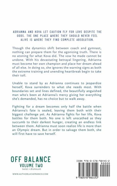 Adrianna and Kova let caution fly for love despite the odds. The one place where they should never feel alive is where they find complete absolution. Though the dynamics shift between coach and gymnast, nothing can prepare them for the agonizing truth. There is no atoning for what Kova did. The vow he made cannot be undone. With his devastating betrayal lingering, Adrianna must become her own champion and place her dream ahead of all else. In doing so, she ignores the warning signs as both the extreme training and unending heartbreak begin to take their toll. Unable to stand by as Adrianna continues to jeopardize herself, Kova surrenders to what she needs most. With boundaries set and lines defined, the beautifully anguished man who's been at Adrianna's mercy giving her everything she's demanded, has no choice but to walk away. Fighting for a dream becomes only half the battle when Adrianna's fate is sealed, leaving them both with their biggest challenge yet. As Adrianna fights for her life, Kova battles for them both. No one is left unscathed as they succumb to their darkest hunger, creating an endless link between them. Adrianna must soon realize life is more than an Olympic dream. But in order to salvage them both, she will first have to save herself.