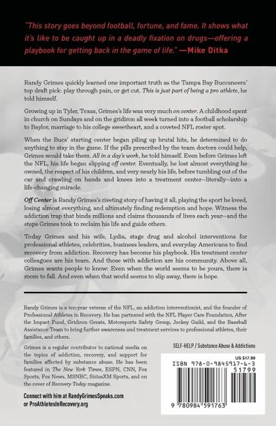 Randy Grimes quickly learned one important truth as the Tampa Bay Buccaneers' top draft pick: play through pain, or get cut. This is just part of being a pro athlete, he told himself. Growing up in Tyler, Texas, Grimes's life was very much on center. A childhood spent in church on Sundays and on the gridiron all week turned into a football scholarship to Baylor, marriage to his college sweetheart, and a coveted NFL roster spot. When the Bucs' starting center began piling up brutal hits, he determined to do anything to stay in the game. If the pills prescribed by the team doctors could help, Grimes would take them. All in a day's work, he told himself. Even before Grimes left the NFL, his life began slipping off center. Eventually, he lost almost everything he owned, the respect of his children, and very nearly his life, before tumbling out of the car and crawling on hands and knees into a treatment center-literally-into a life-changing miracle. Off Center is Randy Grimes's riveting story of having it all, playing the sport he loved, losing almost everything, and ultimately finding redemption and hope. Witness the addiction trap that binds millions and claims thousands of lives each year-and the steps Grimes took to reclaim his life and guide others. Today Grimes and his wife, Lydia, stage drug and alcohol interventions for professional athletes, celebrities, business leaders, and everyday Americans to find recovery from addiction. Recovery has become his playbook. His treatment center colleagues are his team. And those with addiction are his community. Above all, Grimes wants people to know: Even when the world seems to be yours, there is room to fall. And even when that world seems to slip away, there is hope.