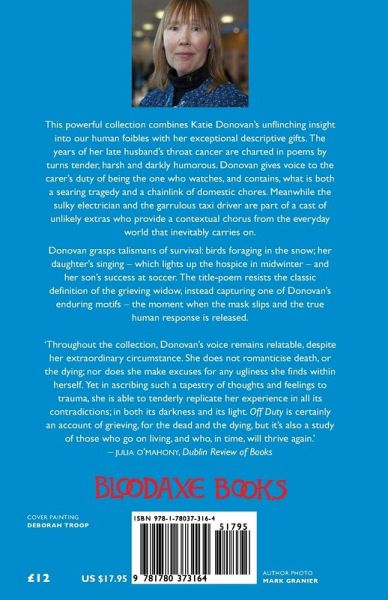 This powerful collection combines Katie Donovan's unflinching insight into our human foibles with her exceptional descriptive gift. The years of her husband's throat cancer are charted in poems by turns tender, harsh and darkly humorous. Donovan gives voice to the carer's duty of being the one who watches, and contains, what is both a searing tragedy and a chainlink of domestic chores. Meanwhile the sulky electrician and the garrulous taxi driver are part of a cast of unlikely extras who provide a contextual chorus from the everyday world that inevitably carries on. Donovan grasps talismans of survival: birds foraging in the snow; her daughter's singing - which lights up the hospice in midwinter - and her son's success at soccer. The title-poem resists the classic definition of the grieving widow, instead capturing one of Donovan's enduring motifs - the moment when the mask slips and the true human response is released.