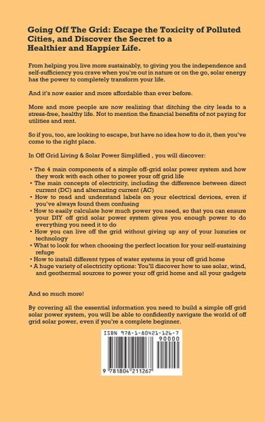 Going Off The Grid: Escape the Toxicity of Polluted Cities, and Discover the Secret to a Healthier and Happier Life. From helping you live more sustainably, to giving you the independence and self-sufficiency you crave when you're out in nature or on the go, solar energy has the power to completely transform your life. And it's now easier and more affordable than ever before. More and more people are now realizing that ditching the city leads to a stress-free, healthy life. Not to mention the financial benefits of not paying for utilities and rent. So if you, too, are looking to escape, but have no idea how to do it, then you've come to the right place. In Off Grid Living & Solar Power Simplified, you will discover: The 4 main components of a simple off-grid solar power system and how they work with each other to power your off grid life The main concepts of electricity, including the difference between direct current (DC) and alternating current (AC) How to read and understand labels on your electrical devices, even if you've always found them confusing How to easily calculate how much power you need, so that you can ensure your DIY off grid solar power system gives you enough power to do everything you need it to do How you can live off the grid without giving up any of your luxuries or technology What to look for when choosing the perfect location for your self-sustaining refuge How to install different types of water systems in your off grid home A huge variety of electricity options: You'll discover how to use solar, wind, and geothermal sources to power your off grid home and all your gadgets And so much more! If you want to skip the complex technical jargon and get straight to building the best off grid solar power system and be ready to live off grid, then scroll up and click the "Add to Cart" button right now.