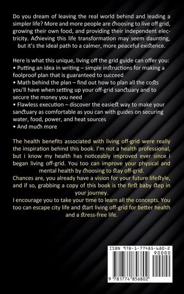 Do you dream of leaving the real world behind and leading a simpler life? More and more people are choosing to live off grid, growing their own food, and providing their independent electricity. Achieving this life transformation may seem daunting, but it's the ideal path to a calmer, more peaceful existence. Here is what this unique, living off the grid guide can offer you:Putting an idea in writing - simple instructions for making a foolproof plan that is guaranteed to succeed Math behind the plan - find out how to plan all the costs you'll have when setting up your off-grid sanctuary and to secure the money you need Flawless execution - discover the easiest way to make your sanctuary as comfortable as you can with guides on securing water, food, power, and heat sources And much more The health benefits associated with living off-grid were really the inspiration behind this book. I'm not a health professional, but i know my health has noticeably improved ever since i began living off-grid. You too can improve your physical and mental health by choosing to stay off-grid. Chances are, you already have a vision for your future lifestyle, and if so, grabbing a copy of this book is the first baby step in your journey. I encourage you to take your time to learn all the concepts. You too can escape city life and start living off-grid for better health and a stress-free life.