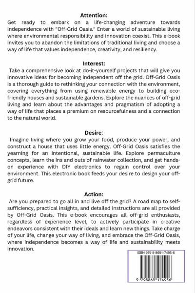 "Off-Grid Oasis: DIY Projects for Sustainable Living" extends an open invitation to embark on a journey toward self-sufficiency in off-grid living. Within its pages, readers will find a wealth of creative solutions designed to break free from conventional utilities and embrace a lifestyle of sustainability and independence. From tapping into renewable energy sources to establishing one's own food and water supply, the book presents a comprehensive guide to constructing an off-grid oasis. Each project is tailored for accessibility, offering clear step-by-step instructions, practical insights, and guidance to empower readers along the way. Whether readers dream of disconnecting from the grid entirely or simply aim to reduce their environmental impact, "Off-Grid Oasis" equips them with the knowledge and skills necessary to thrive off-grid. The satisfaction of generating one's own power, cultivating food, and crafting solutions to life's challenges awaits within these pages. With its focus on sustainability, resilience, and self-reliance, the book empowers readers to seize control of their lives and deepen their connection with the natural world. Embarking on a journey toward off-grid independence, readers unlock the true potential of sustainable living.