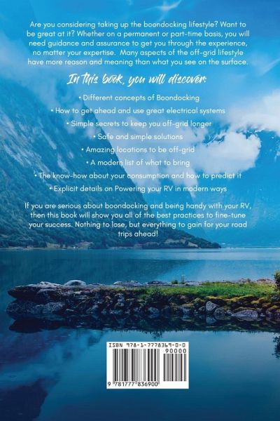 Are you considering taking up the boondocking lifestyle? Want to be great at it? Whether on a permanent or part-time basis, you will need guidance and assurance to get you through the experience, no matter your expertise. Many aspects of the off-grid lifestyle have more reason and meaning than what you see on the surface. In this book, you will discover: - Different concepts of Boondocking - How to get ahead and use great electrical systems - Simple secrets to keep you off-grid longer¿ - Safe and simple solutions¿ - Amazing locations to be off-grid¿ - A modern list of what to bring - The know-how about your consumption and how to predict it - Explicit details on Powering your RV in modern ways¿ If you are serious about boondocking and being handy with your RV, then this book will show you all of the best practices to fine-tune your success. Nothing to lose, but everything to gain for your road trips ahead!