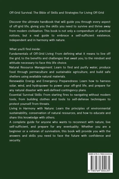 Are you ready to pull the plug and embrace an independent, self-sufficient life?"Yes, but where do I start?" This is the question many people ask when they begin to consider off-grid living. The good news is that you have already found the answer: "Off-grid Survival: The Bible of Off-grid Living Skills and Strategies." This book is the ideal companion for those who, like you, are determined to master the art of survival and live in harmony with nature. Here's what you'll find inside:Fundamentals of Off-Grid Life: Learn how to adapt your mindset, overcome initial challenges, and take advantage of a life away from the net. Essential Resource Management: Learn how to source and conserve water, grow food, and build safe shelters using natural resources. Renewable Energy and Energy Autonomy: From the sun to the wind, learn how to generate and manage energy to power your off-grid home. Emergency Preparedness: Be prepared to deal with natural disasters and other emergencies, with practical strategies and well-defined plans. Basic Survival Skills: From lighting fires to building tools, this book will teach you the skills needed to thrive in the wild. Living in harmony with nature: Adopt a sustainable lifestyle, respecting and conserving the natural resources that surround you. Don't wait any longer! You are one step closer to acquiring the skills you need to begin your journey to self-sufficiency. Go ahead and purchase your ultimate guide to off-grid survival now. Don't miss the opportunity to prepare for a simpler, safer and more deeply connected life.