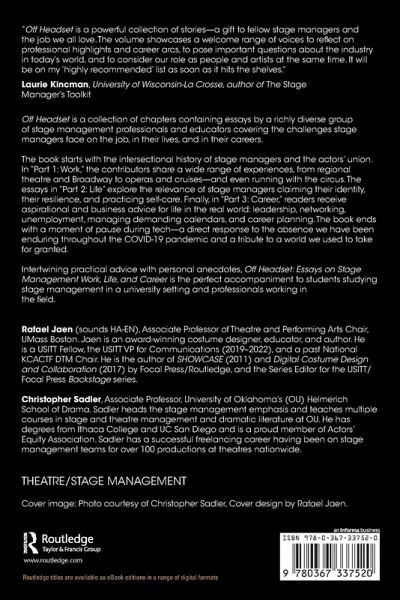 Off Headset is a collection of chapters containing essays by a richly diverse group of stage management professionals and educators covering the challenges stage managers face on the job, in their lives, and in their careers.