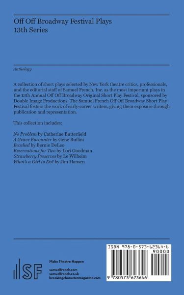 A collection of short plays selected by New York theatre critics, professionals, and the editorial staff of Samuel French, Inc. as the most important plays in the 13th Annual Off Off Broadway Original Short Play Festival, sponsored by Double Image Productions. The Samuel French Off Off Broadway Short Play Festival fosters the work of early-career writers, giving them exposure through publication and representation. This collection includes: No Problem by Catherine Butterfield, A Grave Encounter