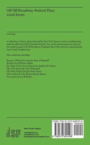 A collection of short plays selected by New York theatre critics, professionals, and the editorial staff of Samuel French, Inc. as the most important plays of the 22nd Annual Off Off Broadway Original Short Play Festival, sponsored by Love Creek Productions. This collection includes: Because I Wanted to Say by Sean O'Donnell, Brothers by William Gadea, For Tiger Lilies Out of Season by Andrea M. Green, The Last Dance by Clare Tattersall, The Most Perfect Day by Peter Ernst, This Is How It Is by