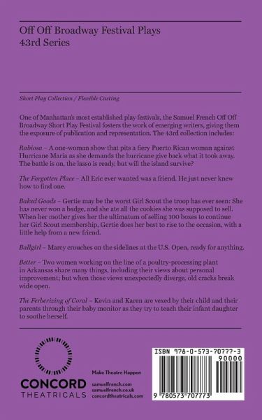 One of Manhattan's most established play festivals, the Samuel French Off Off Broadway Short Play Festival fosters the work of emerging writers, giving them the exposure of publication and representation. The 43rd collection includes: Rabiosa by Nelson Diaz-Marcano The Forgotten Place by Jeff Locker Baked Goods by Charlie Cohen, Helen Park, and Christyn Budzyna Ballgirl by Gracie Gardner Better by Vince Gatton The Ferberizing of Coral by Patrick Flynn