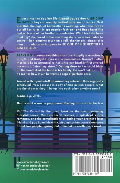 Ever since the day her life flipped upside down, Bridget Hayes obeys a carefully crafted plan. And it works. Or it did. Until the night of her brother's wedding, when she throws out all her rules-in spectacular fashion and finds herself in bed with one of her brother's bandmates. What had she been thinking? She caved to the one thing she can't control-her longtime crush on a tall, charismatic, ginger of a man . . . who also happens to BE ONE OF HER BROTHER'S BEST FRIENDS. Blake Kelly knows two things for sure: happily-ever-after is a myth and Bridget Hayes is risk personified. Doesn't matter that he's been attracted to her since her brother uttered the words, "Meet my sister." Getting close to her could blow up the band. And the band is his family. He can't risk it . . . no matter how much he wants a repeat performance. Armed with a pact-tell no one-they return to their regularly scheduled lives. Because in a city of nine million people, what are the chances they'll bump into each other anytime soon? Nada. Zip. Zilch. That is, until a rescue pup named Destiny turns out to be less dog and more cupid in a fur coat. OFF THE RECORD is the third book in the award-winning Storyhill Musicians series. Mix two secret crushes, a splash of sports romance, and the complications of dating your brother's best friend and you have this witty steamy contemporary romance about two people figuring out if the risk is worth the reward.