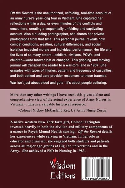 Off the Record is the unauthorized, unfolding, real-time account of an army nurse's year-long tour in Vietnam. She captured her reflections within a day, or even minutes of the conflicts and encounters, creating a sequentially unfolding and captivating account. Also a budding photographer, she shares her private photographs from that time. This personal journal reveals how combat conditions, weather, cultural differences, and social isolation impacted morale and individual performance. Her life and the lives of so many others-soldiers, civilians, POWs, and children-were forever lost or changed. This gripping and moving journal will transport the reader to a war-torn land in 1967. She grapples with types of injuries, pattern and frequency of casualties, and both patient and care provider responses to these traumas. War isn't just about blood and guts-it's about people suffering.