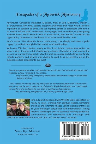 Adventurer, Cartoonist, Innovator, Musician, Man of God, Missionary, Trainer … all characterize John King. Eagerly accepting challenges that most would say were impossible or couldn’t be done, and yet inspiring others to participate with him in his radical "Off the Wall" endeavours. From jungles with crocodiles, to participating in the Guinness World Records with his musical saw, John wouldn’t say NO to any opportunity, sometimes to the dismay of his more sensible wife, Laura. John’s motto: "Live vibrantly; Learn continuously; Love deeply and Leave a godly Legacy" is evident through his life, ministry and relationships. With over 250 short stories, mostly written from John’s creative perspective, we share a slice of humor, a bit of philosophy, a touch of heartache, and some of the lessons we learned through it all. May this book encourage and challenge our family, friends, partners, and all who may choose to read it, as we reveal a few of the experiences God brought into our lives!