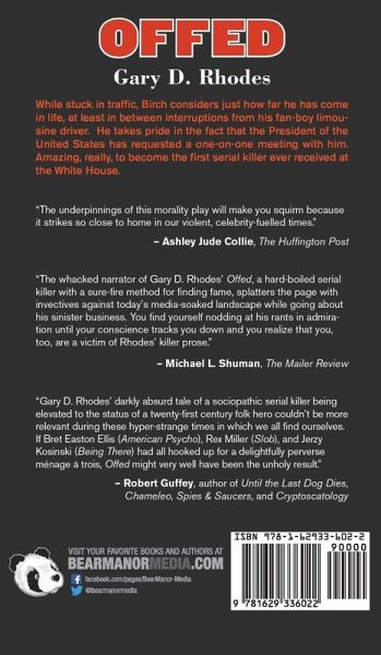 While stuck in traffic, Birch considers just how far he has come in life, at least in between interruptions from his fan-boy limousine driver. He takes pride in the fact that the President of the United States has requested a one-on-one meeting with him. Amazing, really, to become the first serial killer ever received at the White House. "The underpinnings of this morality play will make you squirm because it strikes so close to home in our violent, celebrity-fuelled times." – Ashley Jude Collie, The Huffington Post "The whacked narrator of Gary D. Rhodes’ Offed, a hard-boiled serial killer with a sure-fire method for finding fame, splatters the page with invectives against today’s media-soaked landscape while going about his sinister business. You find yourself nodding at his rants in admiration until your conscience tracks you down and you realize that you, too, are a victim of Rhodes’ killer prose." – Michael L. Shuman, The Mailer Review "Gary D. Rhodes’ darkly absurd tale of a sociopathic serial killer being elevated to the status of a twenty-first century folk hero couldn’t be more relevant during these hyper-strange times in which we all find ourselves. If Bret Easton Ellis (American Psycho), Rex Miller (Slob), and Jerzy Kosinski (Being There) had all hooked up for a delightfully perverse ménage à trois, Offed might very well have been the unholy result." – Robert Guffey, author of Until the Last Dog Dies, Chameleo, Spies & Saucers, and Cryptoscatology