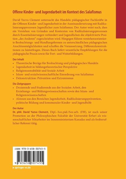 David Yuzva Clement untersucht das Handeln pädagogischer Fachkräfte in der Offenen Kinder- und Jugendarbeit in der Auseinandersetzung mit Radikalisierungsprozessen Jugendlicher zum Salafismus. Der Autor weist nach, dass ein Verstehen von Gründen und Kontexten von Radikalisierungsprozessen durch Essentialisierungen verhindert und Jugendlichen die objektivierte Position "des Anderen" zugeschrieben wird. Hingegen führen verstehensorientierte Beobachtungs- und Handlungsformen zu unterschiedlichen pädagogischen Anschlussmöglichkeiten und schaffen die Voraussetzung, Differenzkonstruktionen zu hinterfragen. Dieses Buch liefert wesentliche Empfehlungen für die pädagogische Praxis sowie für Fort- und Weiterbildungen.