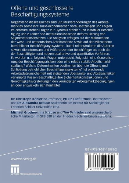 Gegenstand dieses Buches sind Strukturveränderungen des Arbeitsmarktes sowie ihre sozio-ökonomischen Voraussetzungen und Folgen. Im Zentrum steht die Frage nach der Dynamik stabiler und instabiler Beschäftigung. Die Analysen erfolgen auf der Makroebene der west- und ostdeutschen Arbeitsmärkte sowie auf der Mikroebene betrieblicher Beschäftigungssysteme. Dabei rekonstruieren die Autoren sowohl die Interessen und Präferenzen der Beschäftiger als auch die der Beschäftigten und nutzen qualitative und quantitative Verfahren.
