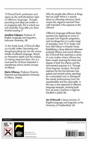Why do people take offence at things that are said? What is it exactly about an offending utterance which causes this negative reaction? How well motivated is the response to the offence? Offensive Language addresses these questions by applying an array of concepts from linguistic pragmatics and sociolinguistics to a wide range of examples, from TV to Twitter and from Mel Gibson to Donald Trump. Establishing a sharp distinction between potential offence and actual offence, Jim O'Driscoll then examines a series of case studies where offence has been caused, assessing the nature and degree of both the offence and the documented response to it. Through close linguistic analysis, this book explores the fine line between free speech and criminal activity, searching for a principled way to distinguish the merely embarrassing from the reprehensible and the censurable. In this way, a new approach to offensive language emerges, involving both how we study it and how it might be handled in public life.