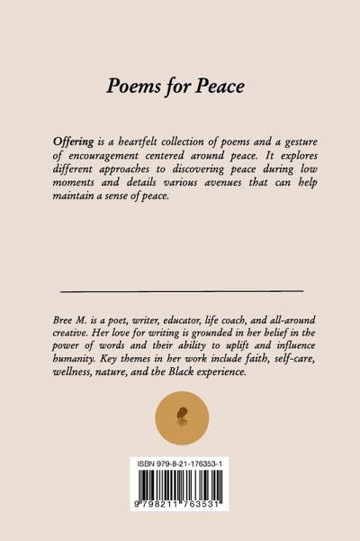 Offering is a heartfelt collection of poems and a gesture of encouragement centered around peace. It explores different approaches to discovering peace during low moments and details various avenues that can help maintain a sense of peace.