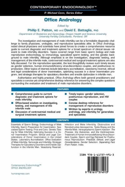 The investigation and management of male infertility can be a formidable diagnostic challenge to family physicians, urologists, and reproductive specialists alike. In Office Andrology, noted clinical physicians and scientists have joined forces to create a comprehensive resource guide to current diagnostic and treatment options for a broad spectrum of clinical issues relevant to male infertility disorders. Topics covered range from basic sperm biology and male reproductive endocrinology, to immunology, specialized sperm testing, and the genetic background to male infertility. Although emphasis is on the investigation, diagnostic testing, and management of the infertile male, controversial medical and surgical treatment options are also fully discussed. For the reproductive specialist, the text thoughtfully reviews such timely issues as gender selection, human immunodeficiency virus-discordance couples, and posthumous reproduction. Other topics of interest include laboratory accreditation, vasectomy reversal, ethical and legal considerations of donor insemination, optimizing success in a donor insemination program, and strategic therapies for ejaculatory disorders and erectile dysfunction in infertile men.