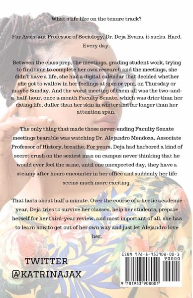 What's life like on the tenure track? For Assistant Professor of Sociology, Dr. Deja Evans, it sucks. Hard. Every day. Between the class prep, the meetings, grading student work, trying to find time to complete her own research and the meetings, she didn't have a life, she had a digital calendar that decided whether she got to wallow in her feelings at 3pm or 7pm, on Thursday or maybe Sunday. And the worst meeting of them all was the two-and-a-half-hour, once a month Faculty Senate, which was drier than her dating life, duller than her skin in winter and far longer than her attention span. The only thing that made those never-ending Faculty Senate meetings bearable was watching Dr. Alejandro Mendoza, Associate Professor of History, breathe. For years, Deja had harbored a kind of secret crush on the sexiest man on campus never thinking that he would ever feel the same, until one unexpected day, they have a steamy after hours encounter in her office and suddenly her life seems much more exciting. That lasts about half a minute. Over the course of a hectic academic year, Deja tries to survive her classes, help her students, prepare herself for her third-year review, and most important of all, she has to learn how to get out of her own way and just let Alejandro love her.
