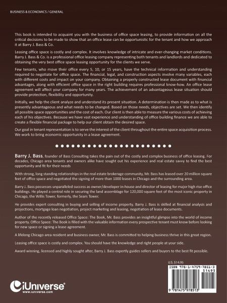 Barry J. Bass, founder of Bass Consulting takes the pain out of the costly and complex business of office leasing. For decades, Chicago area tenants and owners alike have sought out his experience and real estate savvy to find the best opportunity and fit for their needs With strong, long standing relationships in the real estate brokerage community, Mr. Bass has leased over 20 million square feet of office space and negotiated the signing of more than 1000 leases in Chicago and the surrounding area. Barry J. Bass possesses unparalleled success as owner/developer in-house and director of leasing for major high rise office buildings. He played a central role in securing the land assemblage for 120,000 square feet of the most iconic property in Chicago, the Willis Tower, formerly, the Sears Tower. He provides expert consulting in buying and selling of income property. Barry J. Bass is skilled at financial analysis and projections, mortgage loan negotiation, project marketing and leasing, negotiation of lease documents. Author of the recently released Office Space: The Book, Mr. Bass provides an insightful glimpse into the world of income property. Office Space: The Book is filled with the valuable information every prospective tenant must know before looking for new space or signing a lease agreement. A lifelong Chicago area resident and business owner, Mr. Bass is committed to helping business thrive in this great region. Leasing office space is costly and complex. You should have the knowledge and right people at your side. Award winning, licensed and highly sought aft er, Barry J. Bass expertly guides sellers and buyers to the best fit possible.