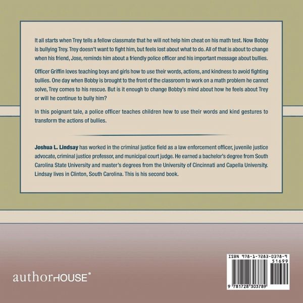It all starts when Trey tells a fellow classmate that he will not help him cheat on his math test. Now Bobby is bullying Trey. Trey doesn't want to fight him, but feels lost about what to do. All of that is about to change when his friend, Jose, reminds him about a friendly police officer and his important message about bullies. Officer Griffin loves teaching boys and girls how to use their words, actions, and kindness to avoid fighting bullies. One day when Bobby is brought to the front of the classroom to work on a math problem he cannot solve, Trey comes to his rescue. But is it enough to change Bobby's mind about how he feels about Trey or will he continue to bully him? In this poignant tale, a police officer teaches children how to use their words and kind gestures to transform the actions of bullies.