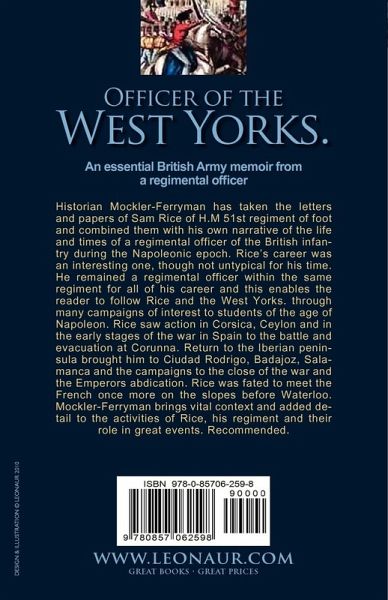 An essential British Army memoir from a regimental officer Historian Mockler-Ferryman has taken the letters and papers of Sam Rice of H.M 51st regiment of foot and combined them with his own narrative of the life and times of a regimental officer of the British infantry during the Napoleonic epoch. Rice's career was an interesting one, though not untypical for his time. He remained a regimental officer within the same regiment for all of his career and this enables the reader to follow Rice and the West Yorks. through many campaigns of interest to students of the age of Napoleon. Rice saw action in Corsica, Ceylon and in the early stages of the war in Spain to the battle and evacuation at Corunna. Return to the Iberian peninsula brought him to Ciudad Rodrigo, Badajoz, Salamanca and the campaigns to the close of the war and the Emperors abdication. Rice was fated to meet the French once more on the slopes before Waterloo. Mockler-Ferryman brings vital context and added detail to the activities of Rice, his regiment and their role in great events. Recommended.