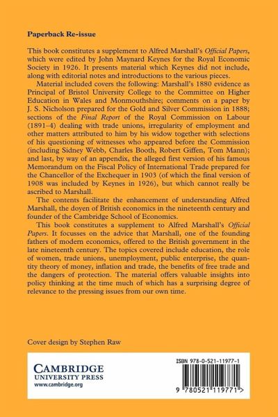 This book constitutes a supplement to the 1926 account of Alfred Marshall's Official Papers edited by John Maynard Keynes. The book presents material which Keynes did not include, editorial notes and introductions to the various pieces. It focuses on the advice that Marshall, a founding father of modern economics, offered to the British government in the late nineteenth century. The topics covered include education, the role of women, trade unions, unemployment, public enterprise, the quantity theory of money, inflation and trade, benefits of free trade and dangers of protection. The material offers valuable insights into policy thinking at the time, much of which has a surprising degree of relevance to pressing policy issues during our own time. The contents facilitates understanding this doyen of British economics and founder of the Cambridge School of Economics.