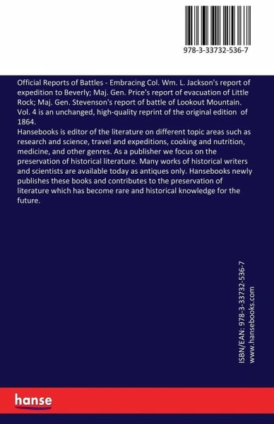 Official Reports of Battles - Embracing Col. Wm. L. Jackson's report of expedition to Beverly; Maj. Gen. Price's report of evacuation of Little Rock; Maj. Gen. Stevenson's report of battle of Lookout Mountain. Vol. 4 is an unchanged, high-quality reprint of the original edition of 1864.