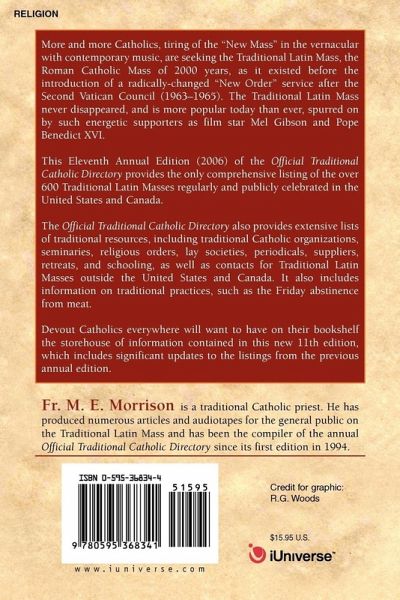 More and more Catholics, tiring of the 'New Mass" in the vernacular with contemporary music, are seeking the Traditional Latin Mass, the Roman Catholic Mass of 2000 years, as it existed before the introduction of a radically-changed 'New Order" service after the Second Vatican Council (1963-1965). The Traditional Latin Mass never disappeared, and is more popular today than ever, spurred on by such energetic supporters as film star Mel Gibson and Pope Benedict XVI. This Eleventh Annual Edition (2006) of the Official Traditional Catholic Directory provides the only comprehensive listing of the over 600 Traditional Latin Masses regularly and publicly celebrated in the United States and Canada. The Official Traditional Catholic Directory also provides extensive lists of traditional resources, including traditional Catholic organizations, seminaries, religious orders, lay societies, periodicals, suppliers, retreats, and schooling, as well as contacts for Traditional Latin Masses outside the United States and Canada. It also includes information on traditional practices, such as the Friday abstinence from meat. Devout Catholics everywhere will want to have on their bookshelf the storehouse of information contained in this new 11th edition, which includes significant updates to the listings from the previous annual edition.