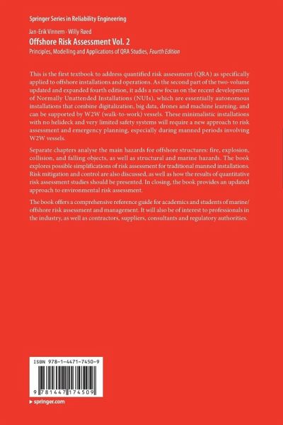 This is the first textbook to address quantified risk assessment (QRA) as specifically applied to offshore installations and operations. As the second part of the two-volume updated and expanded fourth edition, it adds a new focus on the recent development of Normally Unattended Installations (NUIs), which are essentially autonomous installations that combine digitalization, big data, drones and machine learning, and can be supported by W2W (walk-to-work) vessels. These minimalistic installations with no helideck and very limited safety systems will require a new approach to risk assessment and emergency planning, especially during manned periods involving W2W vessels.