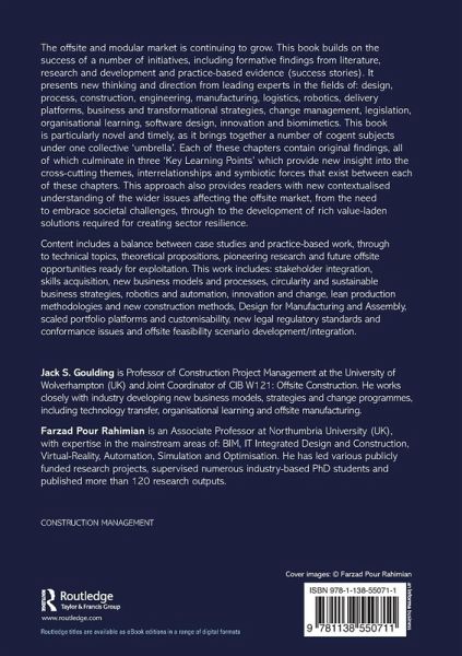 The offsite and modular market is continuing to grow. This book builds on the success of a number of initiatives, including formative findings from literature, research and development and practice-based evidence (success stories). It presents new thinking and direction from leading experts in the fields of: design, process, construction, engineering, manufacturing, logistics, robotics, delivery platforms, business and transformational strategies, change management, legislation, organisational learning, software design, innovation and biomimetics. This book is particularly novel and timely, as it brings together a number of cogent subjects under one collective 'umbrella'. Each of these chapters contain original findings, all of which culminate in three 'Key Learning Points' which provide new insight into the cross-cutting themes, interrelationships and symbiotic forces that exist between each of these chapters. This approach also provides readers with new contextualised understanding of the wider issues affecting the offsite market, from the need to embrace societal challenges, through to the development of rich value-laden solutions required for creating sector resilience. Content includes a balance between case studies and practice-based work, through to technical topics, theoretical propositions, pioneering research and future offsite opportunities ready for exploitation. This work includes: stakeholder integration, skills acquisition, new business models and processes, circularity and sustainable business strategies, robotics and automation, innovation and change, lean production methodologies and new construction methods, Design for Manufacturing and Assembly, scaled portfolio platforms and customisability, new legal regulatory standards and conformance issues and offsite feasibility scenario development/integration.